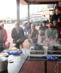 This is an alfresco, demonstration-style cooking class conducted at the front of the shop.